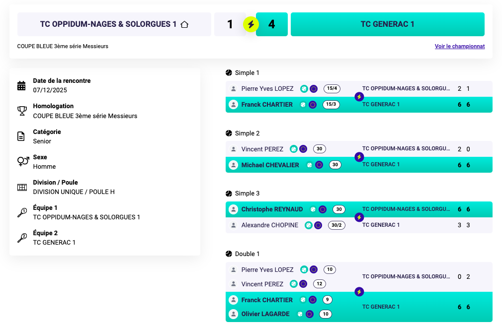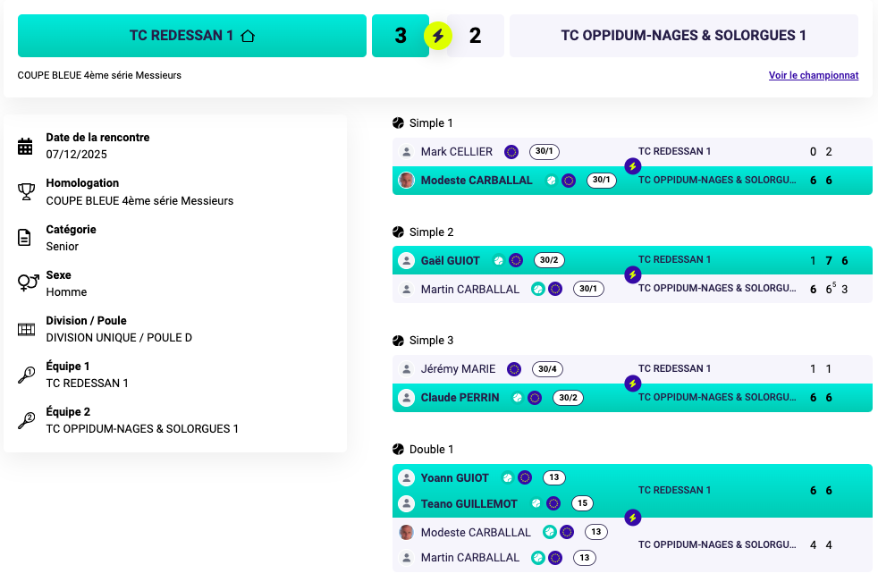 | 08/12 | TC Bouillargues | TCO Nages | 3-2